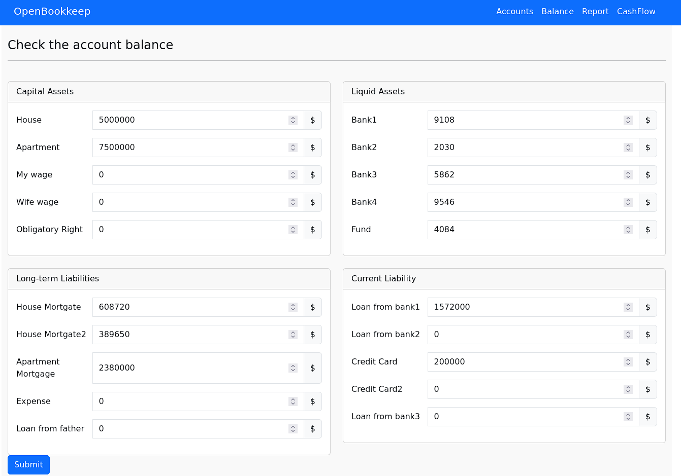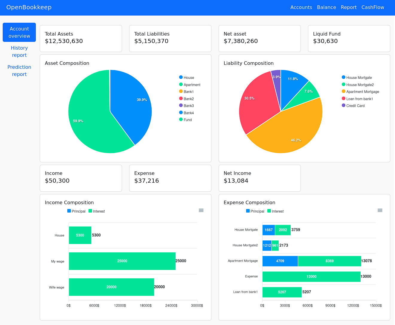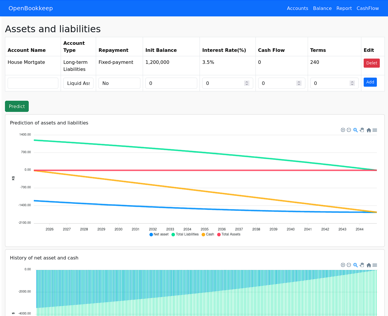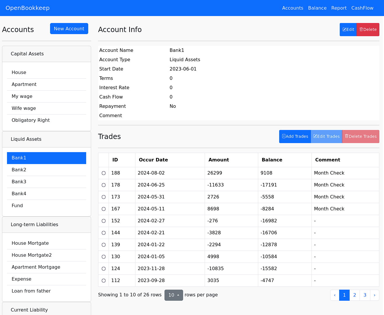 OpenBookkeeping is a project developed by myself, an open-source tool that tracks personal assets and liabilities through regular reconciliations. It also generates rich reports, including changes in assets and liabilities, future cash flow predictions, and more.